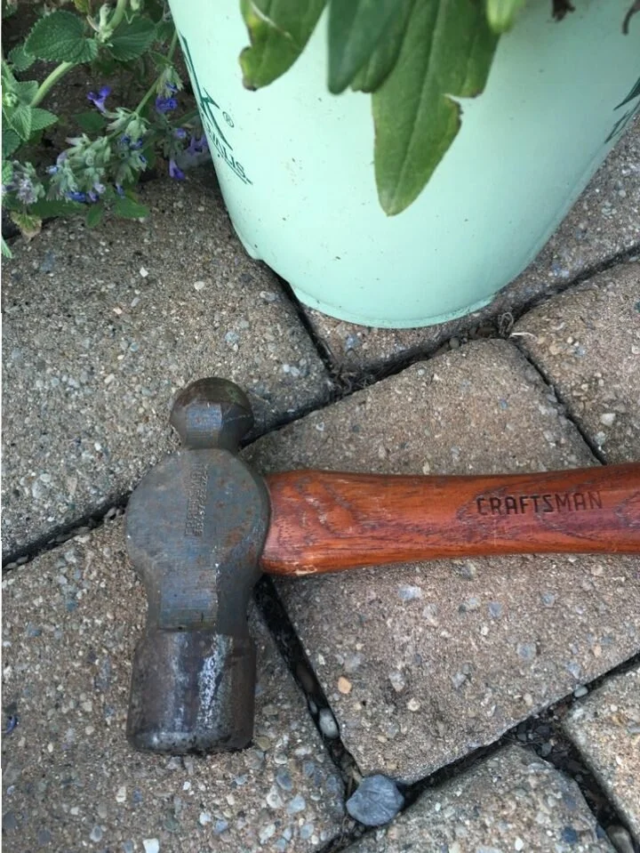 Finally, realizing the lily wasn’t going to budge without reinforcements, I went and got a most unlikely gardening assistant from the garage, a rather ancient but most efficient-looking hammer. The poor lily surely must’ve been shocked when I started whacking away on the bottom of the pot, but sure enough, those roots began to loosen and she slowly slid out of that constricting, binding, even smothering plastic pot and into my gloved hands, indeed, her roots were much in need of more room to stretch and grow.