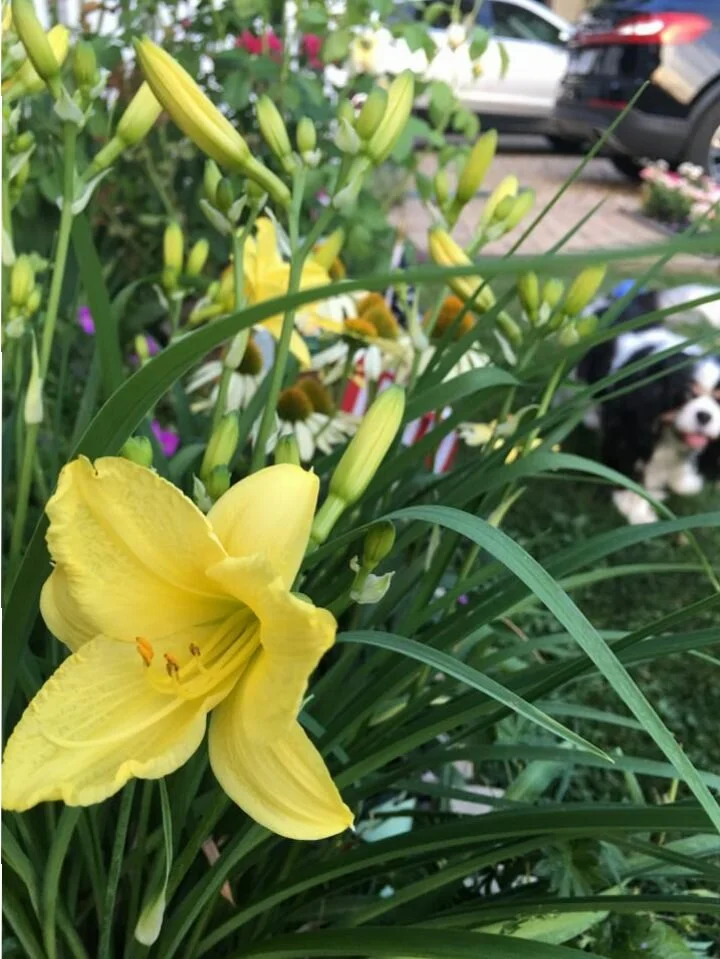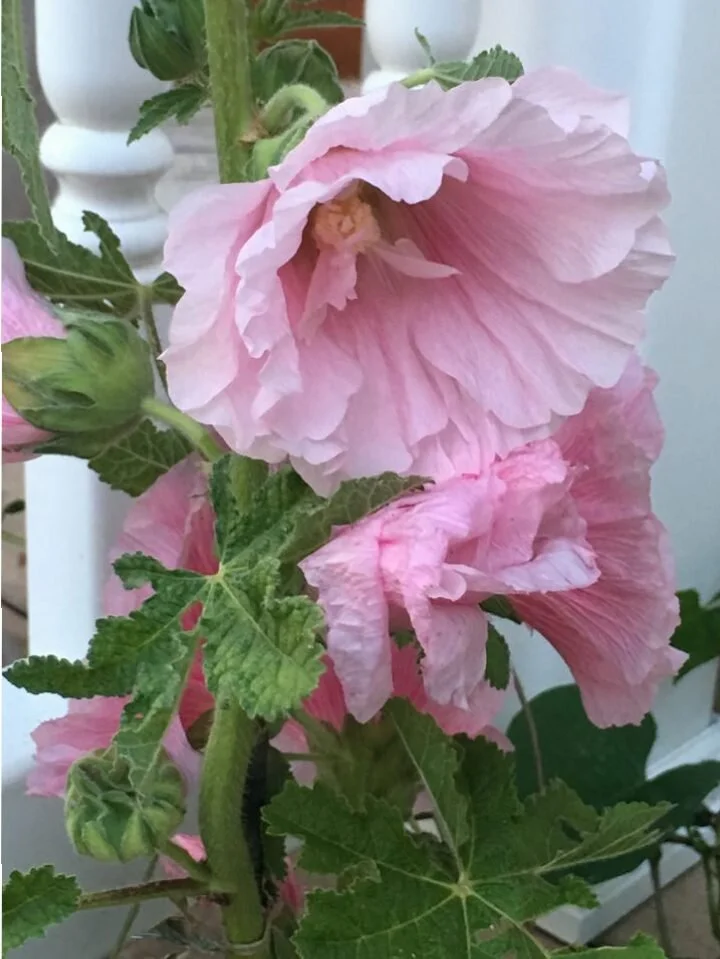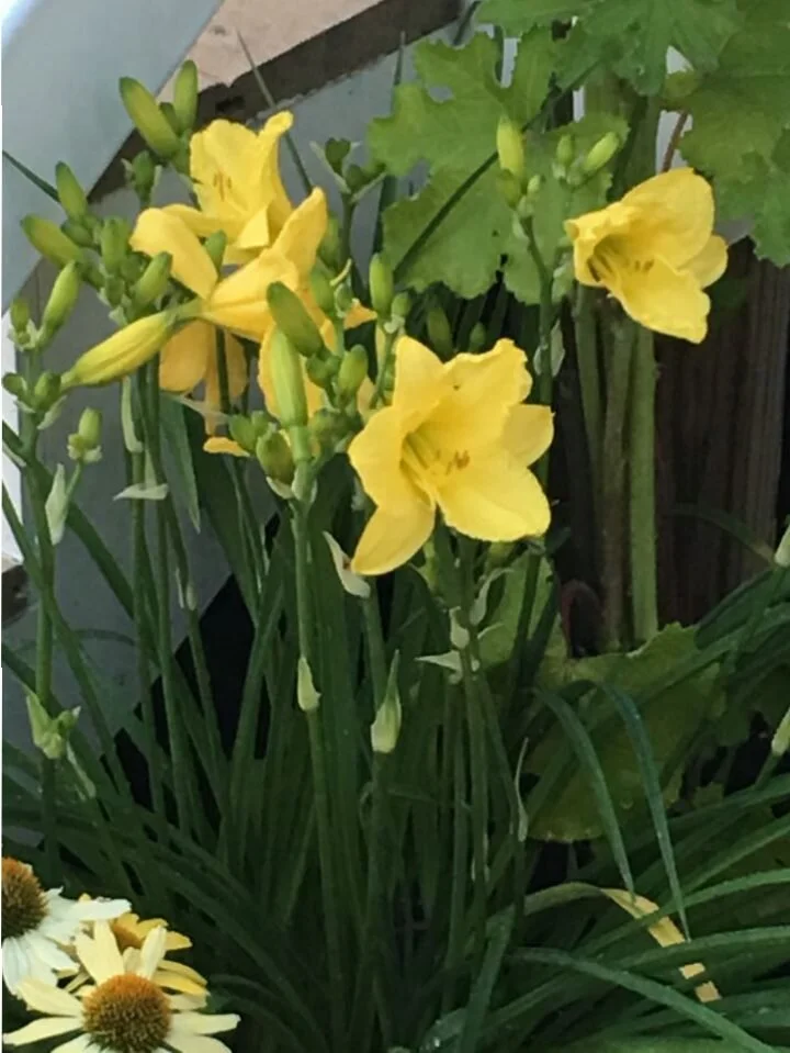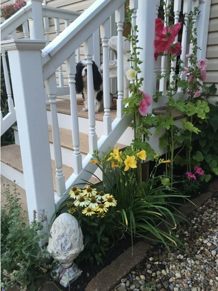 /I was out this afternoon working in the small kitchen flower border, which Agatha had said needed something cheery planted to welcome visitors. It’s a tiny spot with just room enough for a handful of plants, it’s the perfect spot for something showy and colorful to make people smile. I had been to the garden center earlier and picked out the most beautiful yellow daylily, a cheery coneflower, several old-fashioned pink Hollyhocks, and a baby Heavenly Blue morning glory and couldn’t wait to tuck them into their new home.